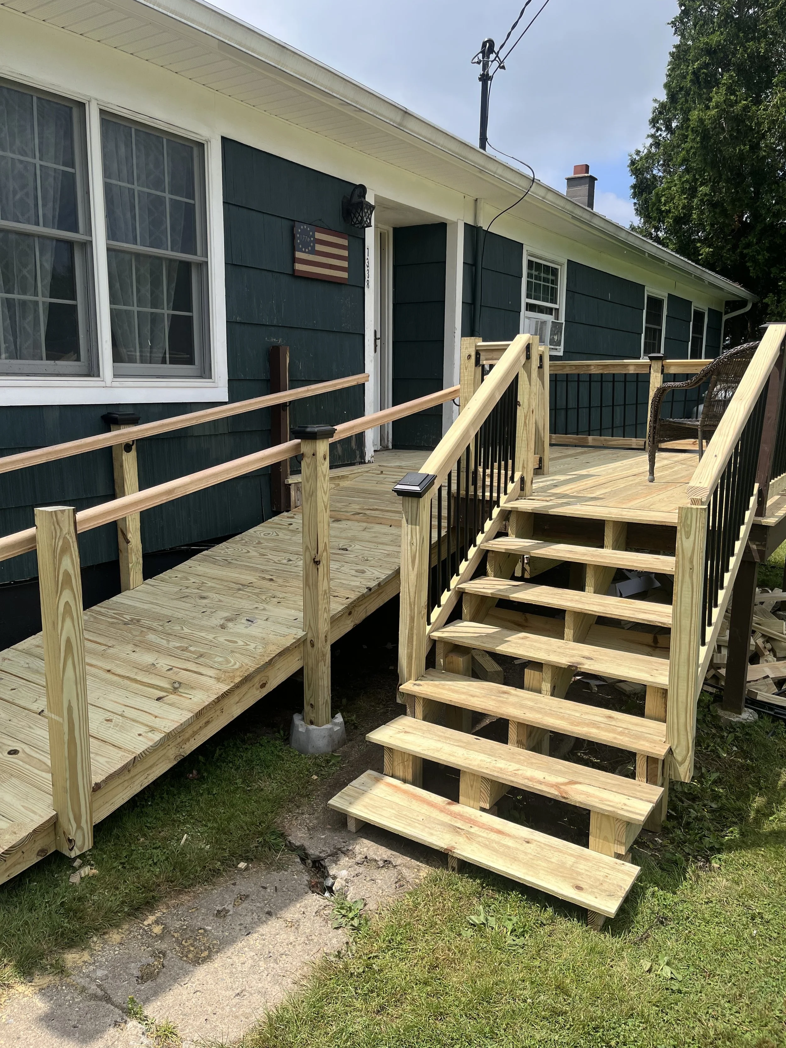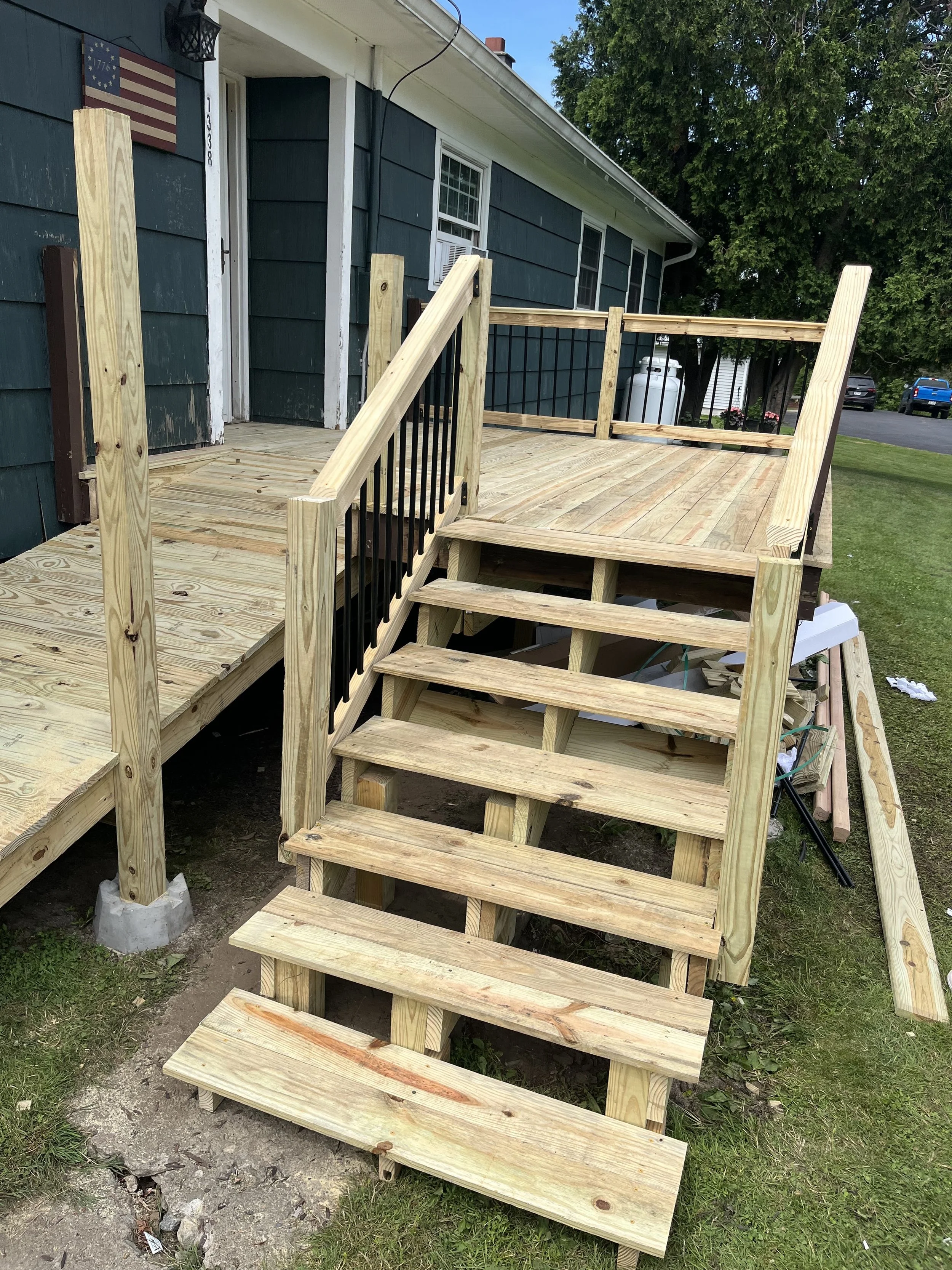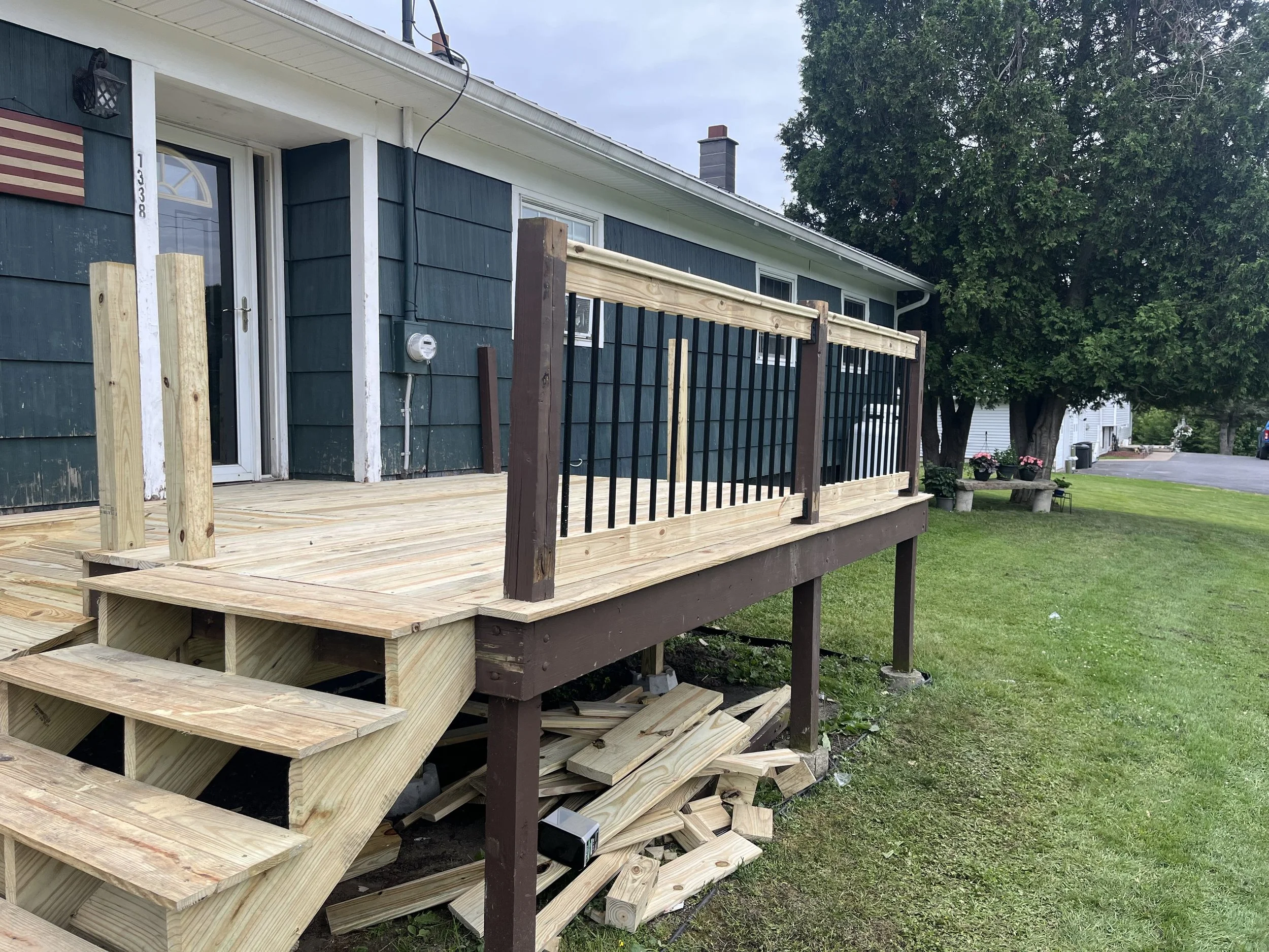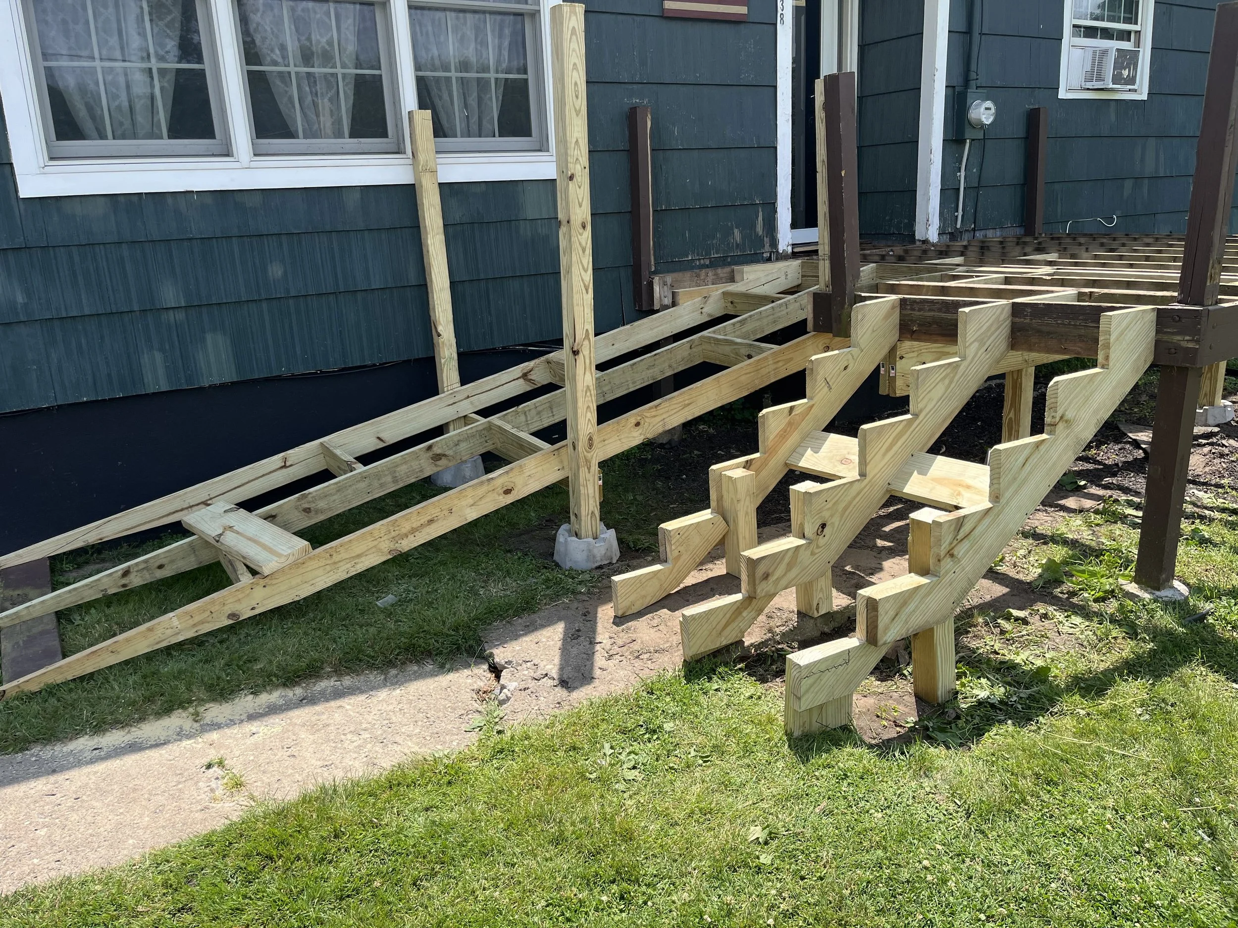 At this job, Nostrom Handyman Services (NHS) refurbished the old deck. replaced joists, joist hangers, stairs, railing, and the deck boards. Added a ramp to the end of the deck along with a railing on it too.