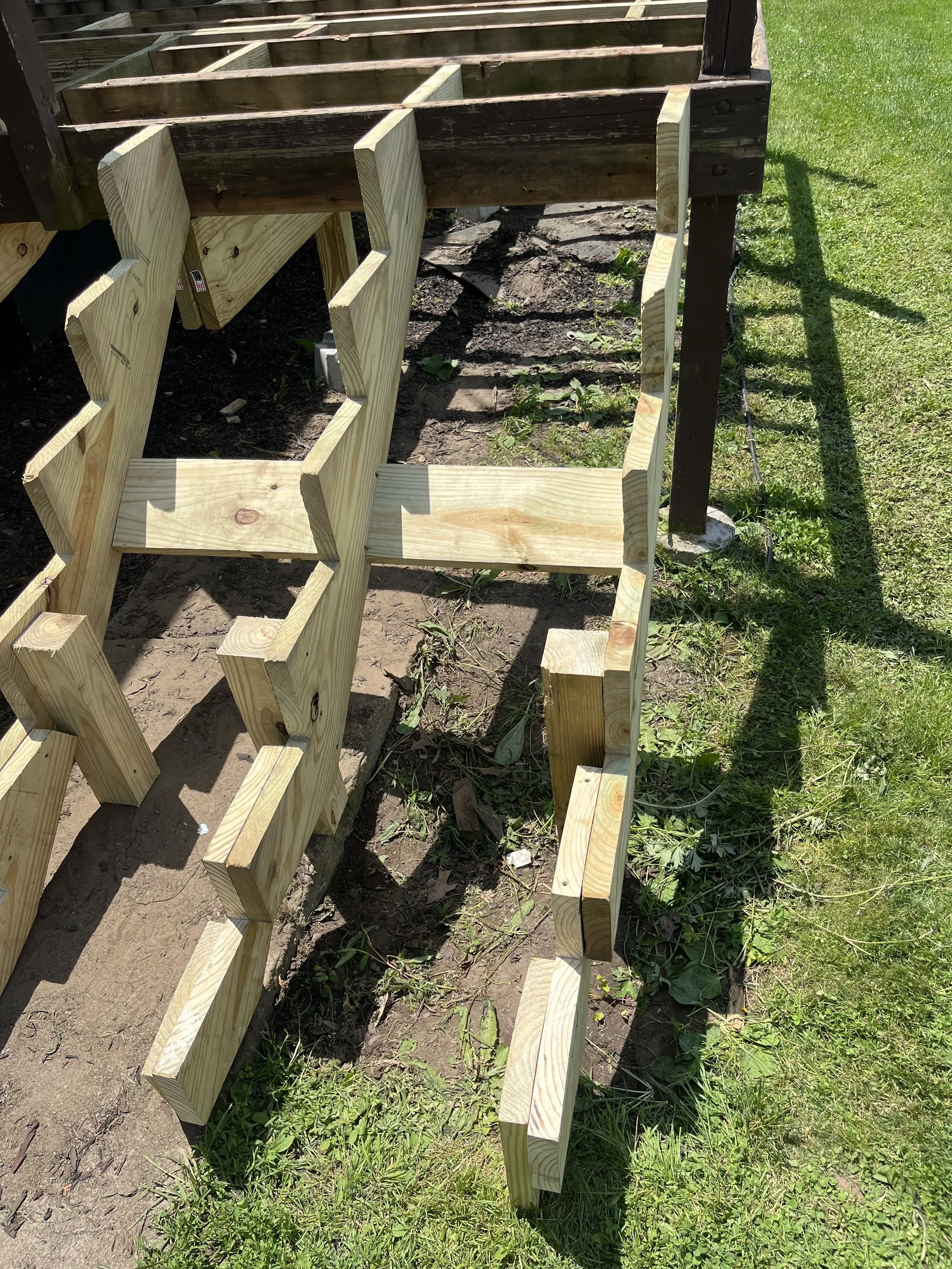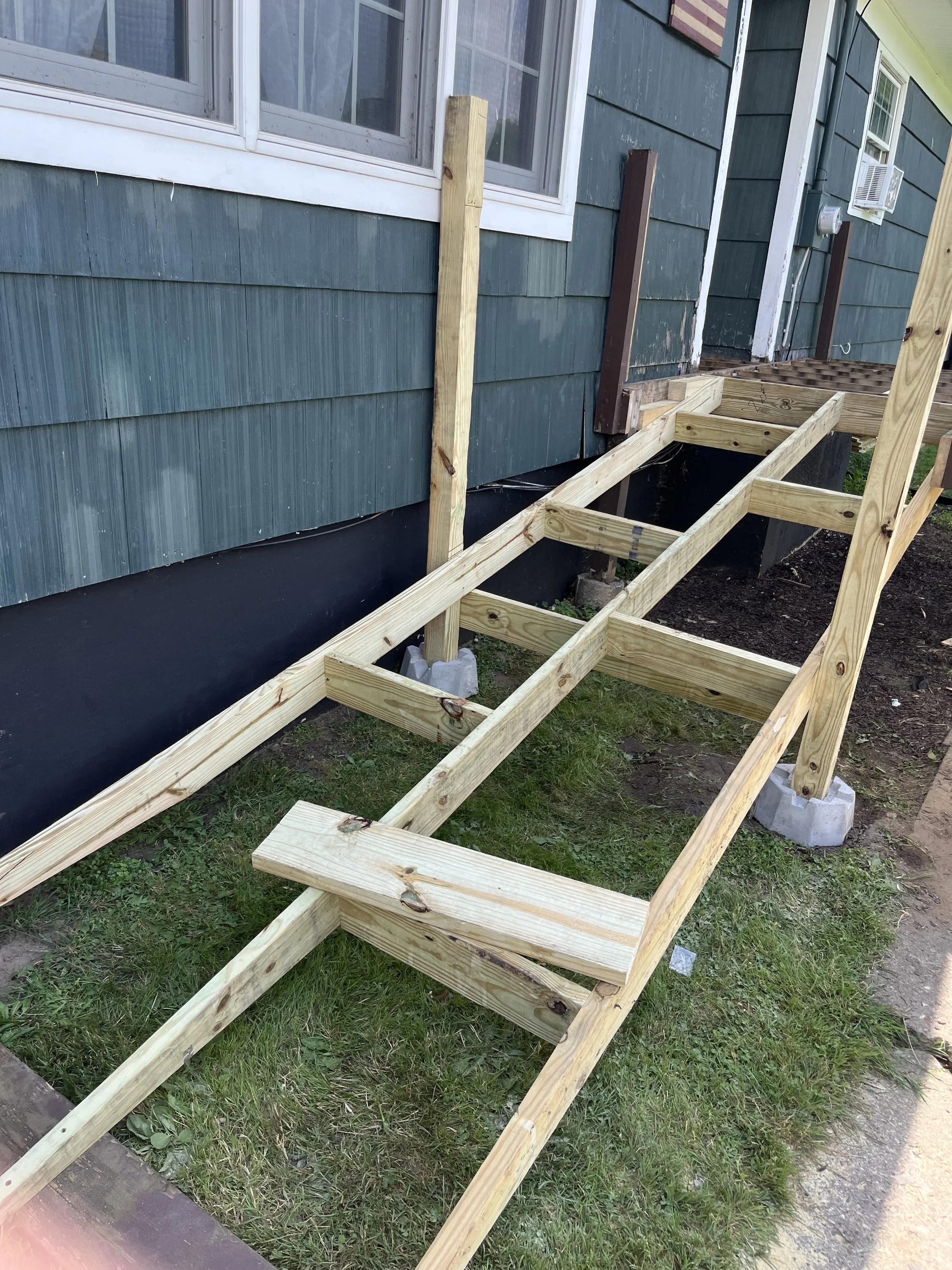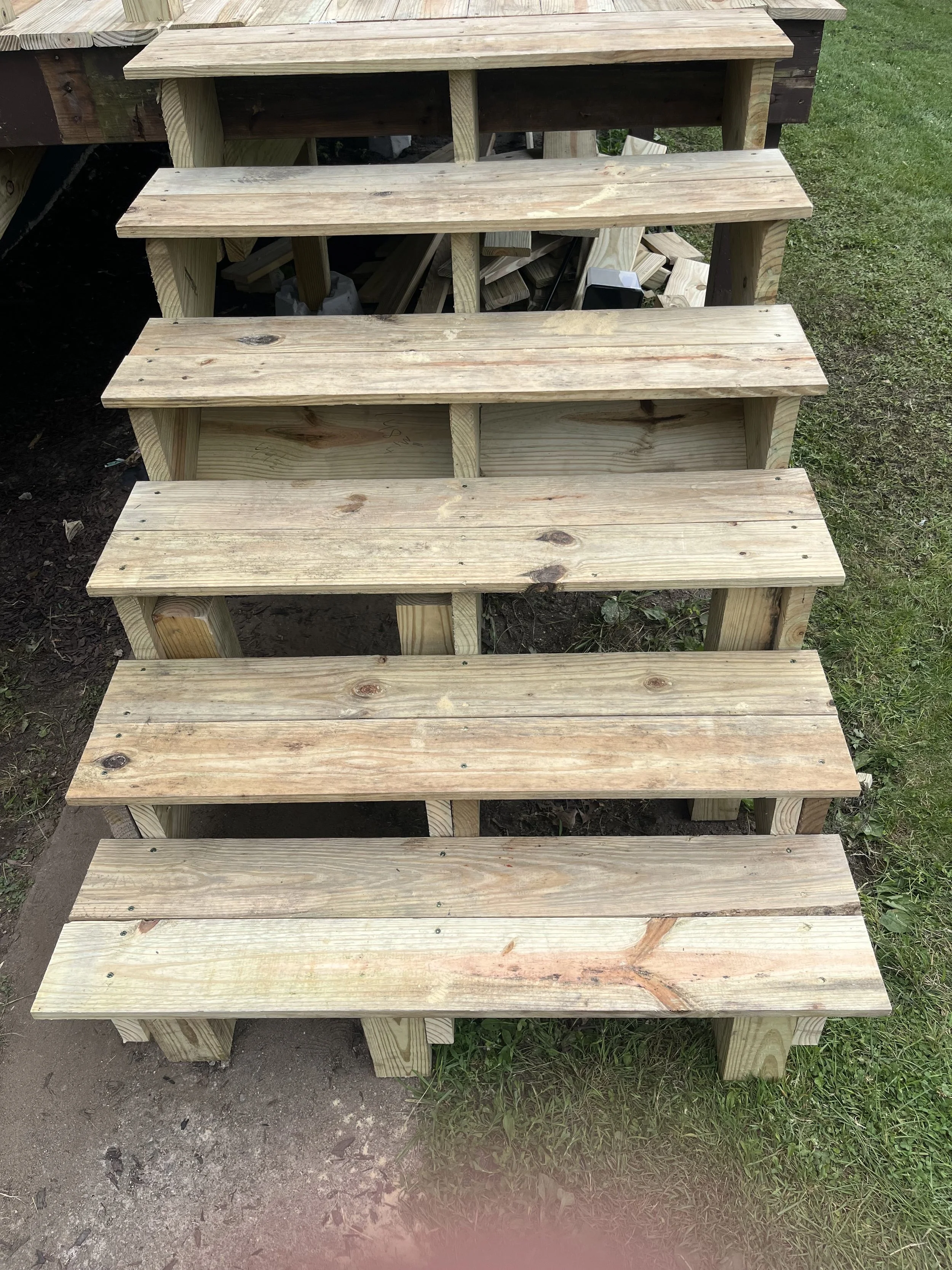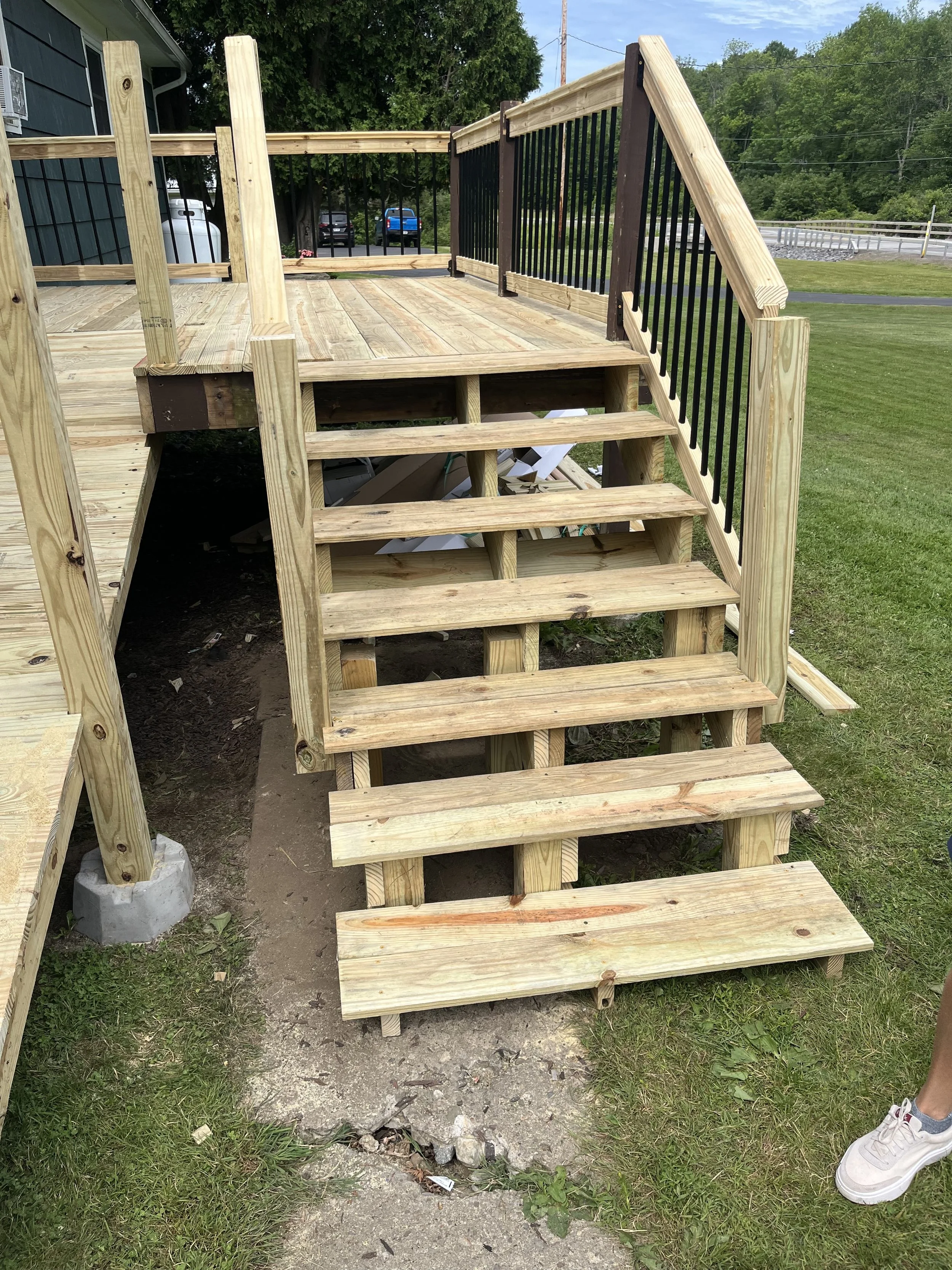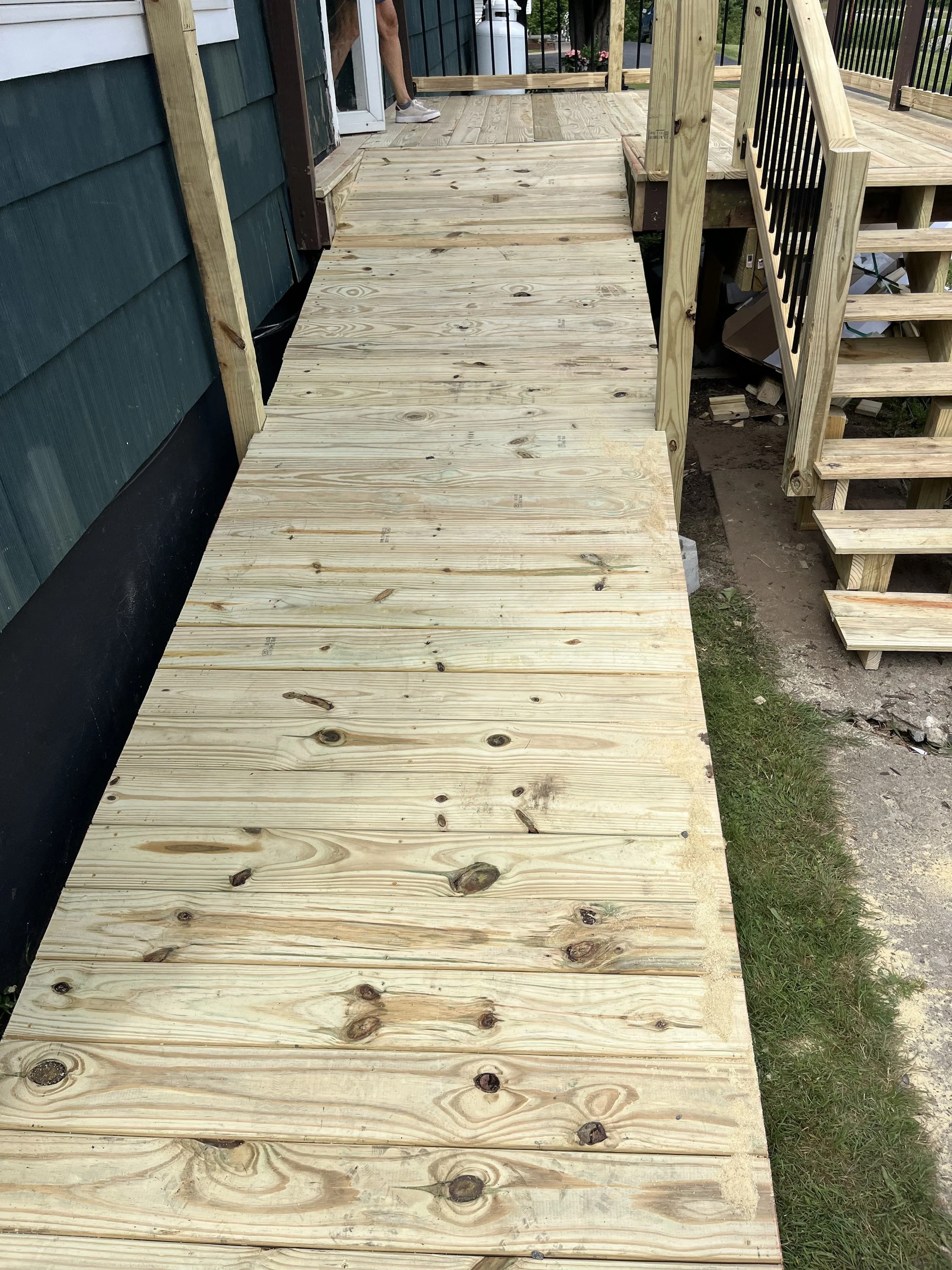 At this job, Nostrom Handyman Services (NHS) refurbished the old deck. replaced joists, joist hangers, stairs, railing, and the deck boards. Added a ramp to the end of the deck along with a railing on it too.