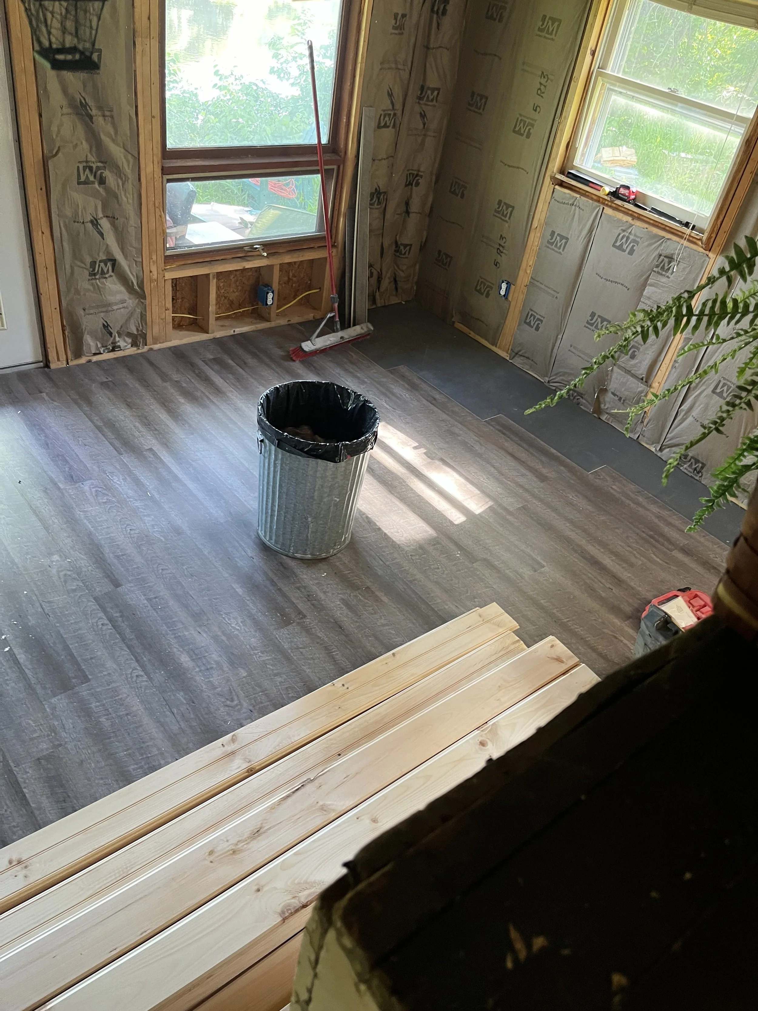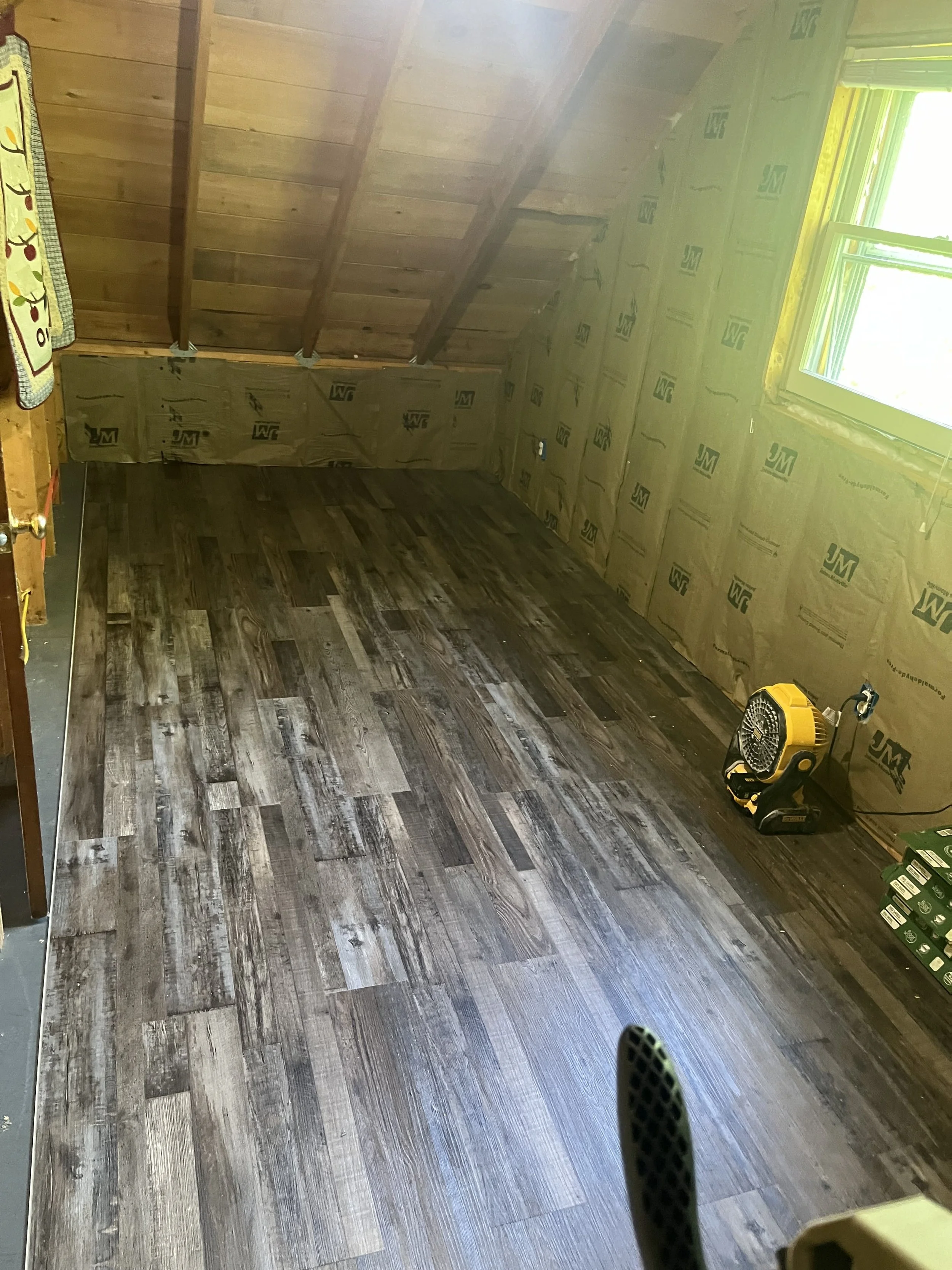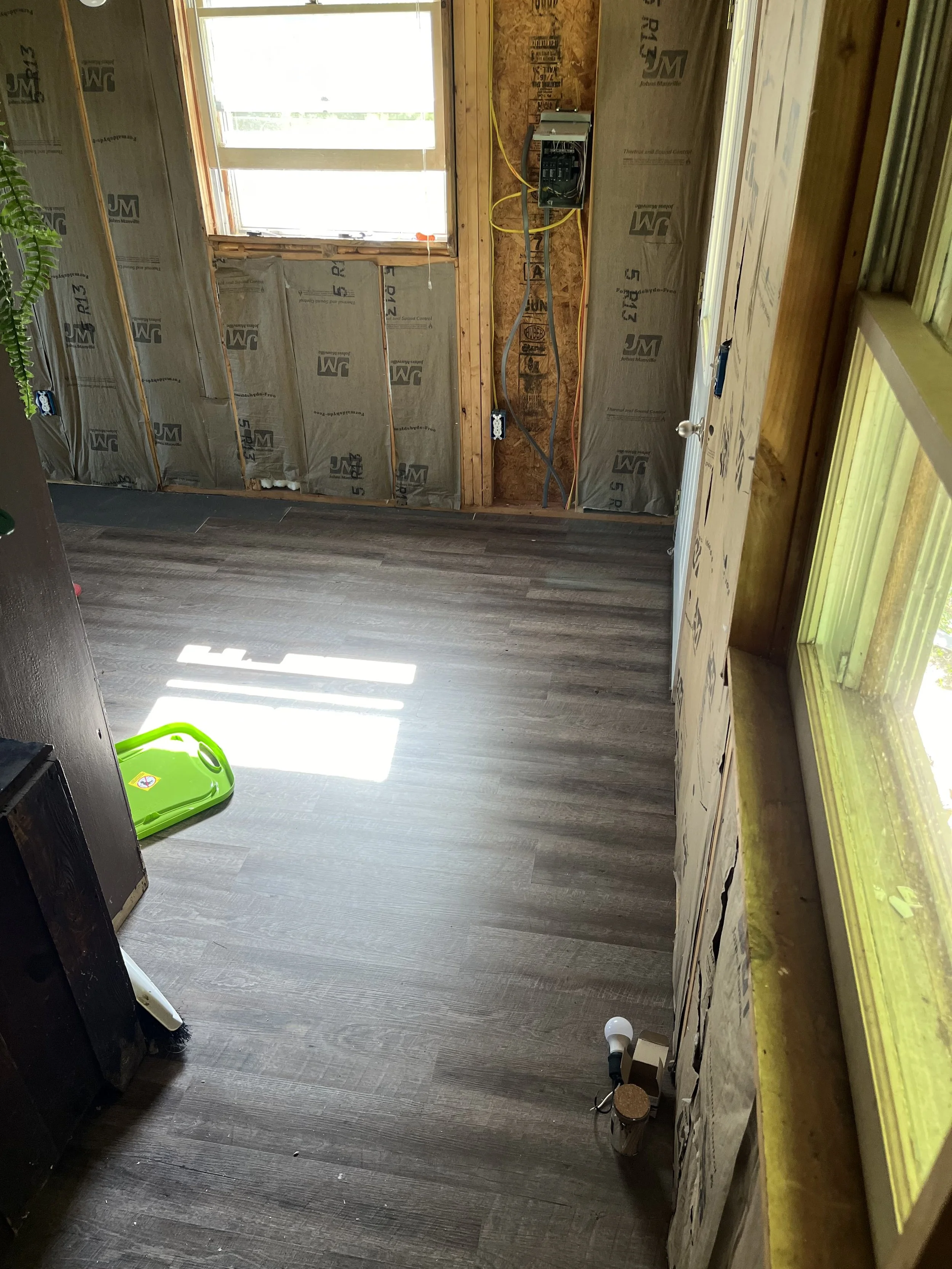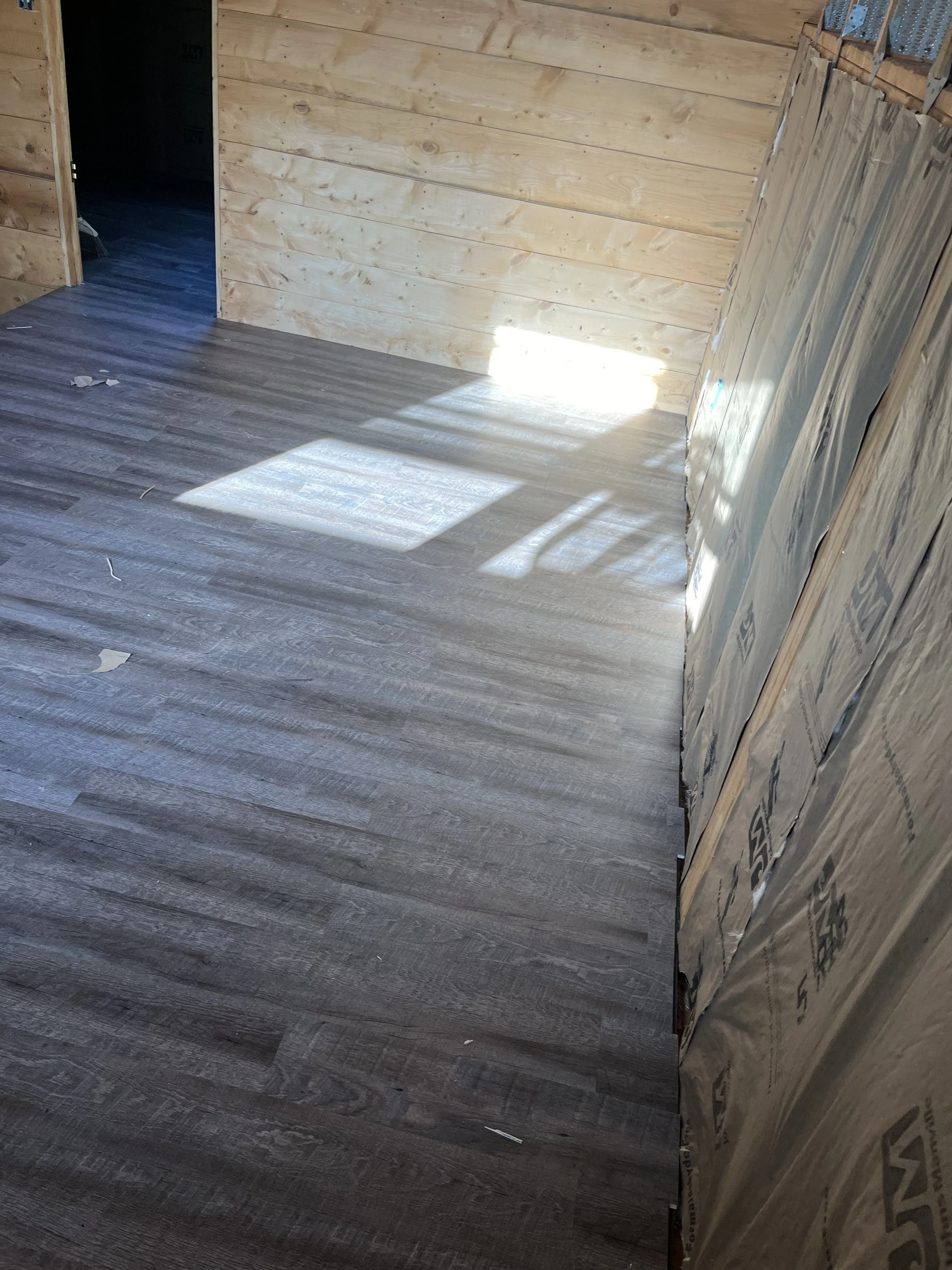At this job, Nostrom Handyman Services (NHS) Gutted entire building and replaced all electrical. Installed new insulation and water heater. Installed new vinyl flooring and covered the insulation/walls with tongue and groove pine.
