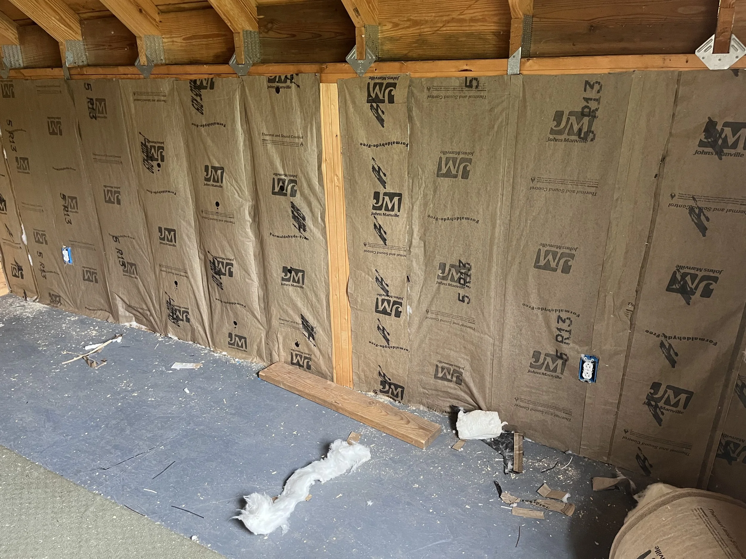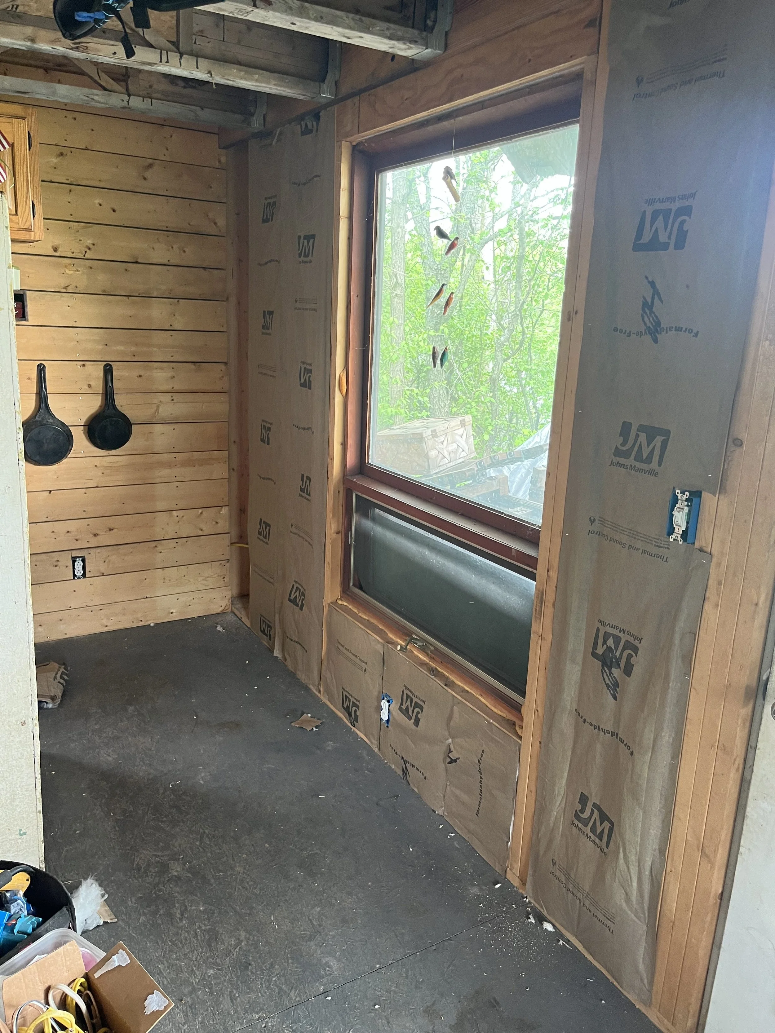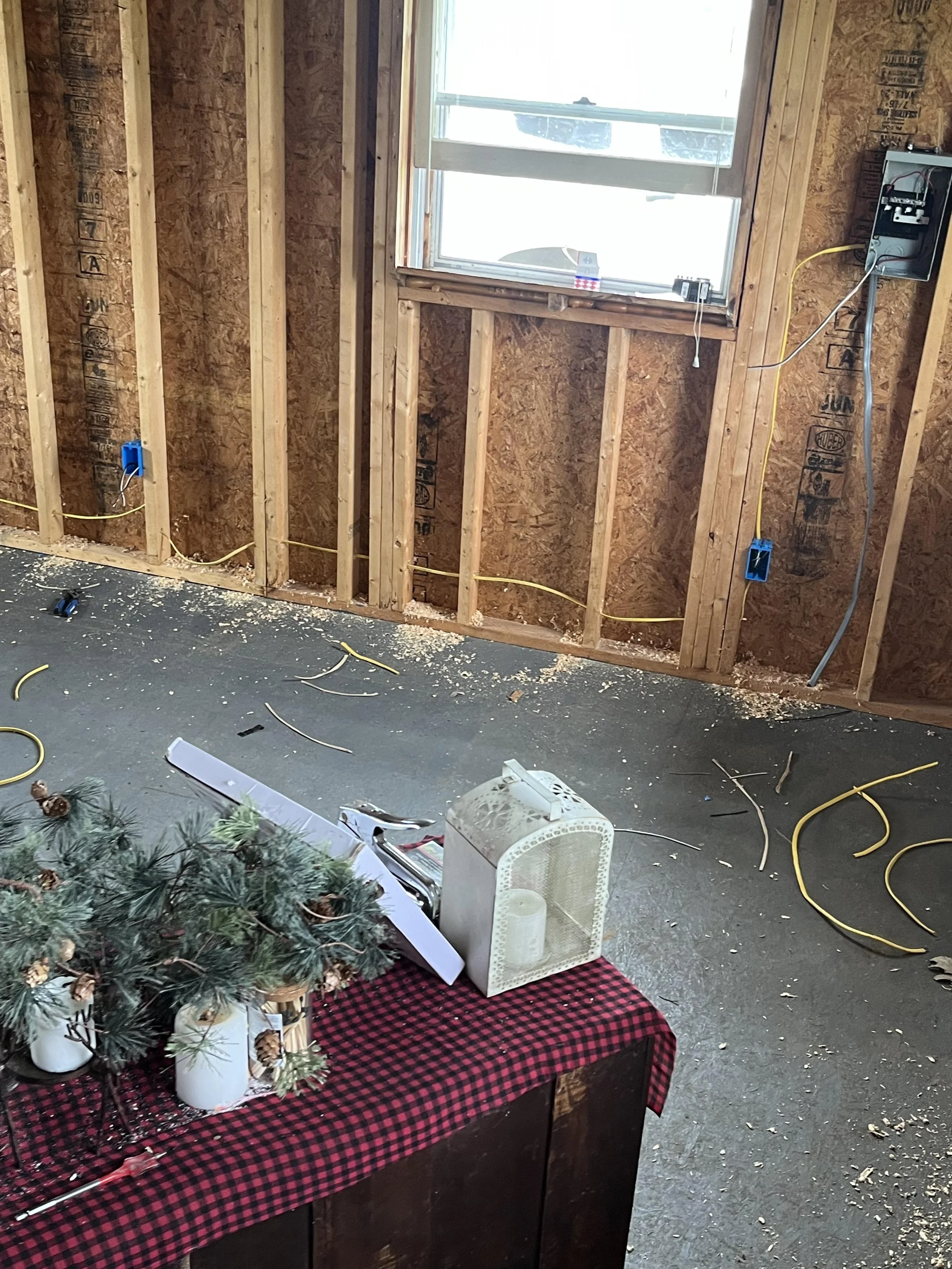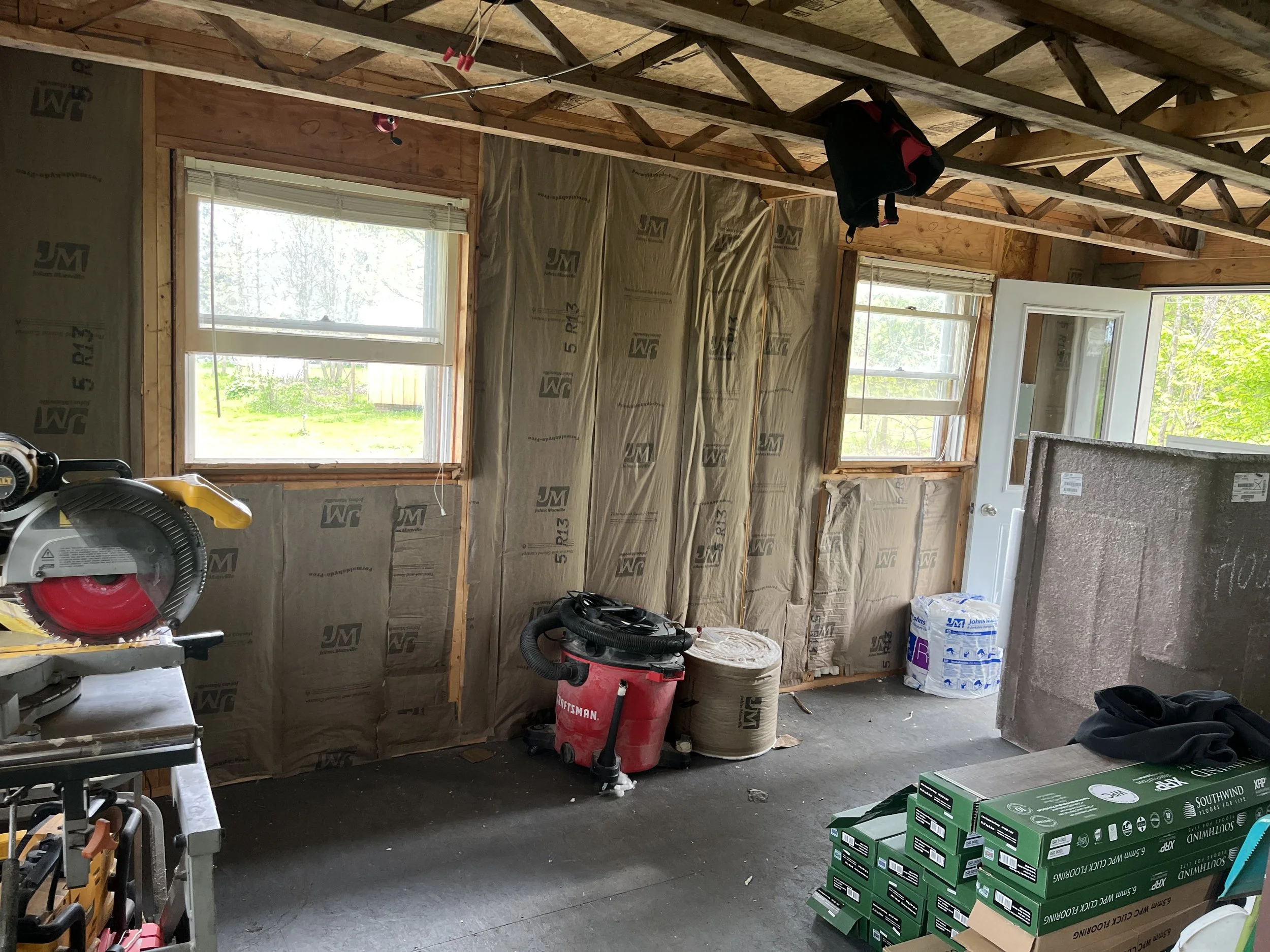 At this job, Nostrom Handyman Services (NHS) Gutted entire building and replaced all electrical. Installed new insulation and water heater. Installed new vinyl flooring and covered the insulation/walls with tongue and groove pine.